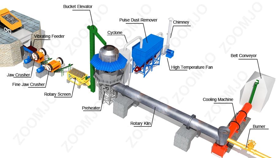 Во время рабочего процесса бокситовой вращающейся печи сырьевой порошок подается в бочку печи из подающей трубы на верхнем конце бочки в конце печи, и из-за наклона и медленного вращения бочки печи, материал производит сложное движение, кувыркаясь по окружности и перемещаясь от высокой температуры к нижней в осевом направлении. Топливо впрыскивается из головки печи и сжигается в печи, выделяемое тепло нагревает сырье и превращает его в клинкер. Горячий воздух, образующийся в процессе обмена с материалом, поступает в систему печи на входе в печь и, наконец, выбрасывается в атмосферу через дымоход.